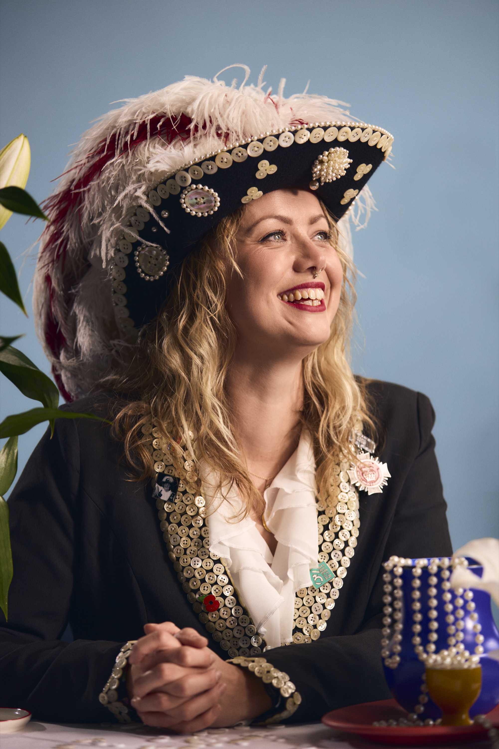 The Pearly Kings and Queens began in nineteenth-century London. Street traders decorated their clothes with mother-of-pearl buttons to show pride, community, and charity.